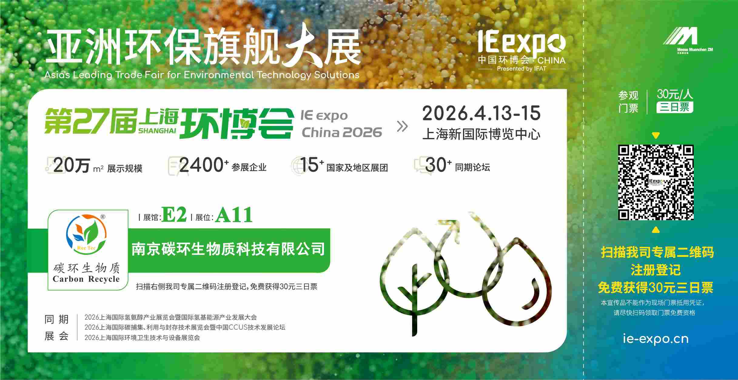 南京碳环生物质科技有限公司将于2026年4月13日-15日在上海新国际博览中心参加第27届上海国际环博会(以下简称“上海环博会”),诚挚邀请您莅临指导,期待与您面对面,共话绿色未来,共谋合作新机。